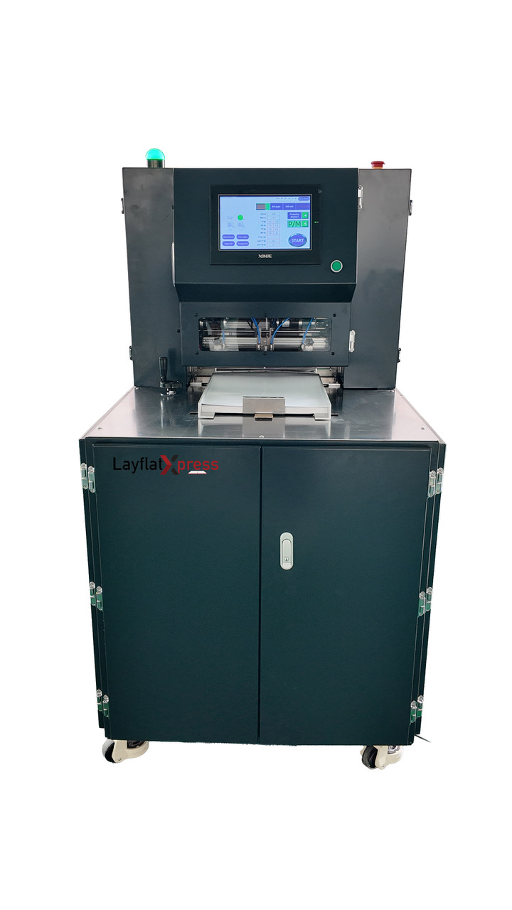 LayflatXpress LF-300XP Layflat Photobook Solution is a fully automatic book block system which produces Layflat book blocks from single sheets. It can make premium book formats, not only by gluing paper back to back, but also by inserting cardboard between sheets. It is all-in-one station, with a creaser and folder included. This excellent machine is compact and can run in small spaces.